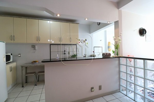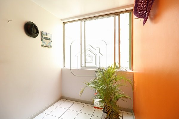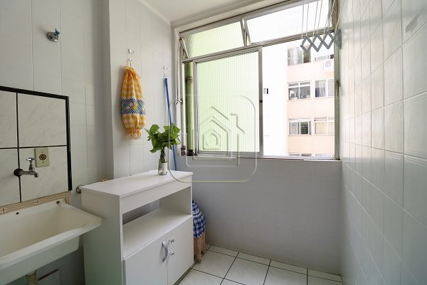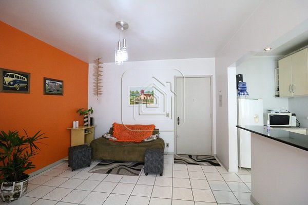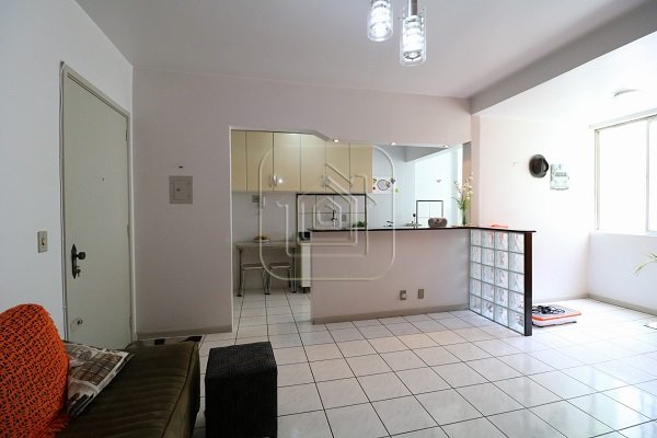 Apartamento de um dormitório, sala de estar, cozinha americana, banheiro social, área de serviço e sacada estendida.