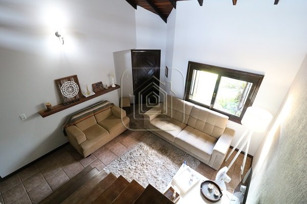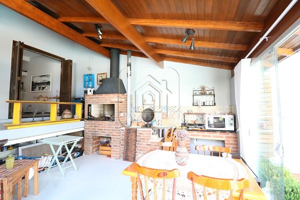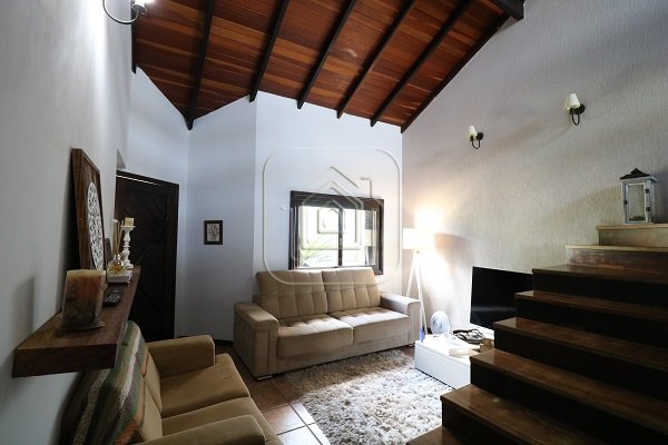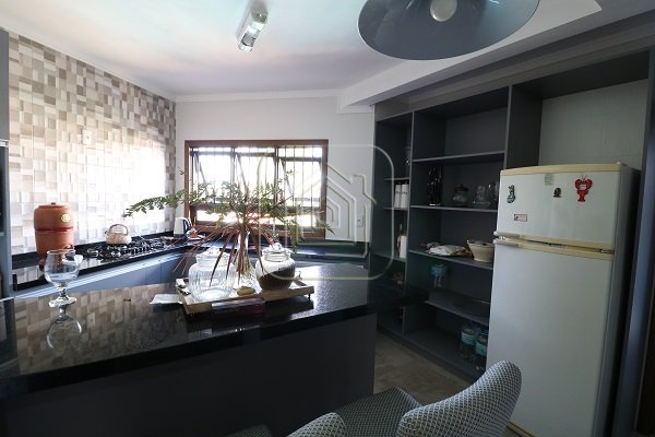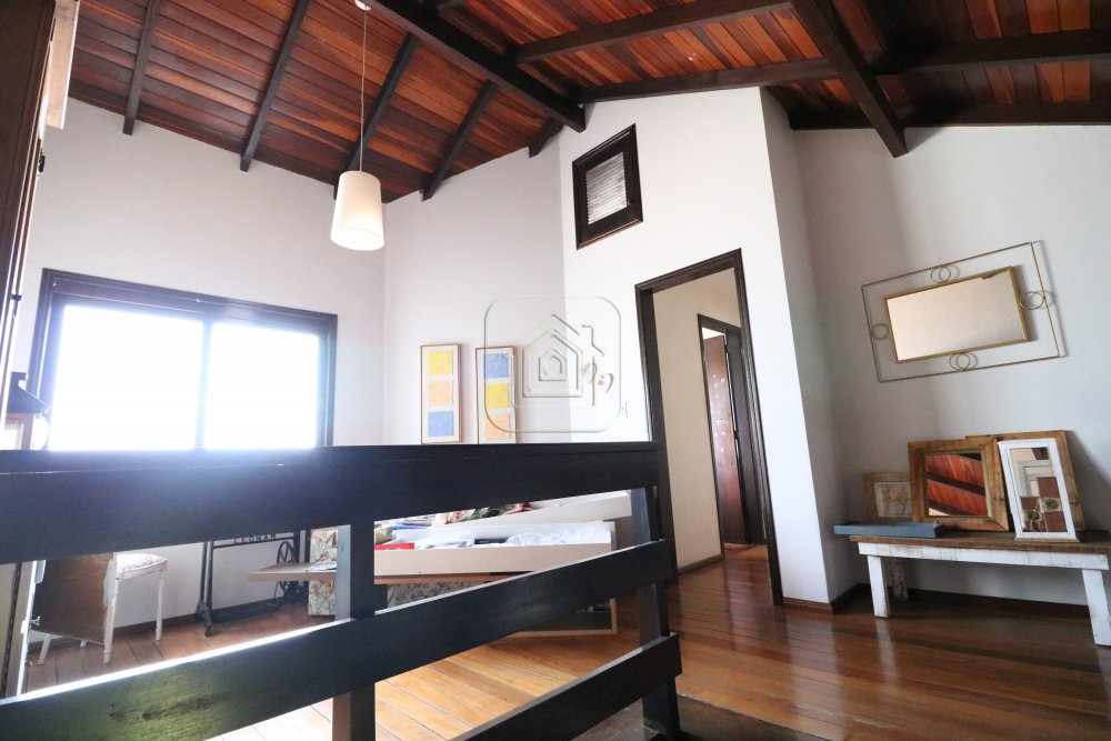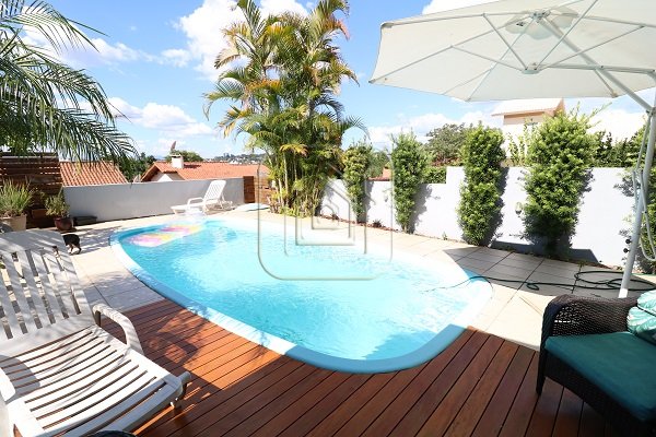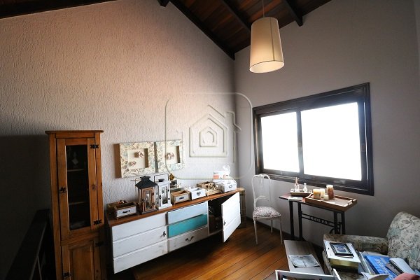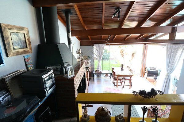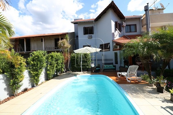 Excelente Casa, no alto, com vista, de ótima construção, de três dormitórios, sendo uma suíte com closet e sacada, três salas, pé direito alto, com madeira aparente, cozinha em conceito aberto, espaço gourmet com churrasqueira e lado envidraçado com vista para piscina.